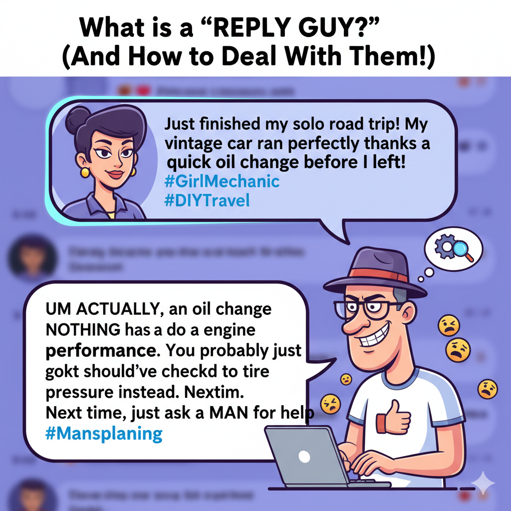 Many reply guys engage in mansplaining, explaining something to someone (often a woman) in a condescending way, especially about topics the person clearly already understands. This can happen regardless of the reply guy's gender, though the term originally described male behavior.